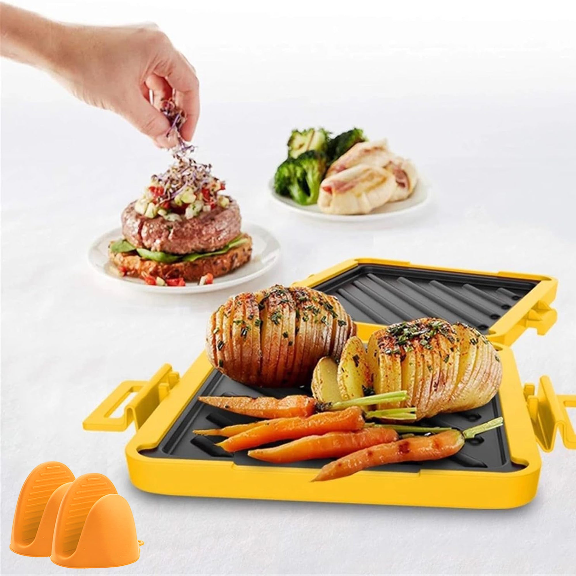 Fast Cooking with High Grill Efficiency: Heats up to 500°F in under a minute using microwave heat conversion delivers crispy results in just 3–5 minutes.Crispy Outside,  Juicy Inside: Achieves golden-brown, evenly heated food  with heat-wave technology—perfect texture and taste  while preserving nutrients. Simple 3-Step Operation: Just fill, close, and microwave   with a mid-way flip—easy enough for beginners.  Compact size (6.29 X 5.5 X 1.18 inch)) and only 0.94 lbs great for dorms, rentals, and travel. Non-Stick & Easy to Clean: Features a non-stick coated  tray and dishwasher-safe components—no more stuck   food or messy cleanups. Portable & Gift-Ready: Ideal for travel, work, RVs or home use.