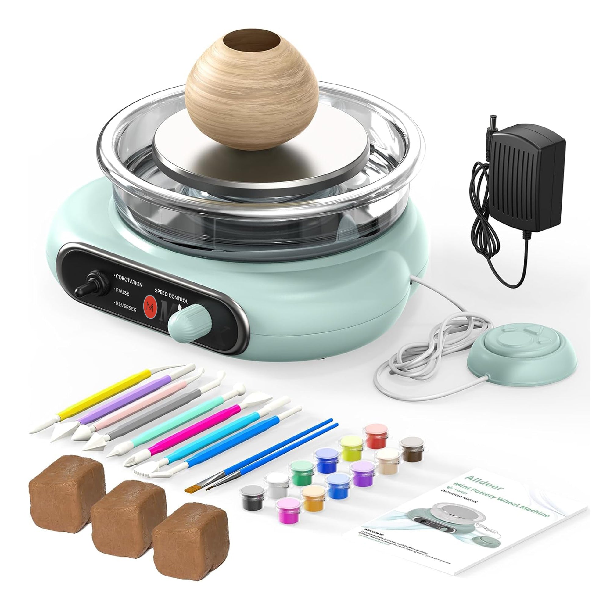Includes pottery wheel, power adapter, 8 sculpting tools, 2 paint brushes, 3 packs of air-dry clay, and 12 vibrant paint colors—ideal for hours of fun and creativity. -
